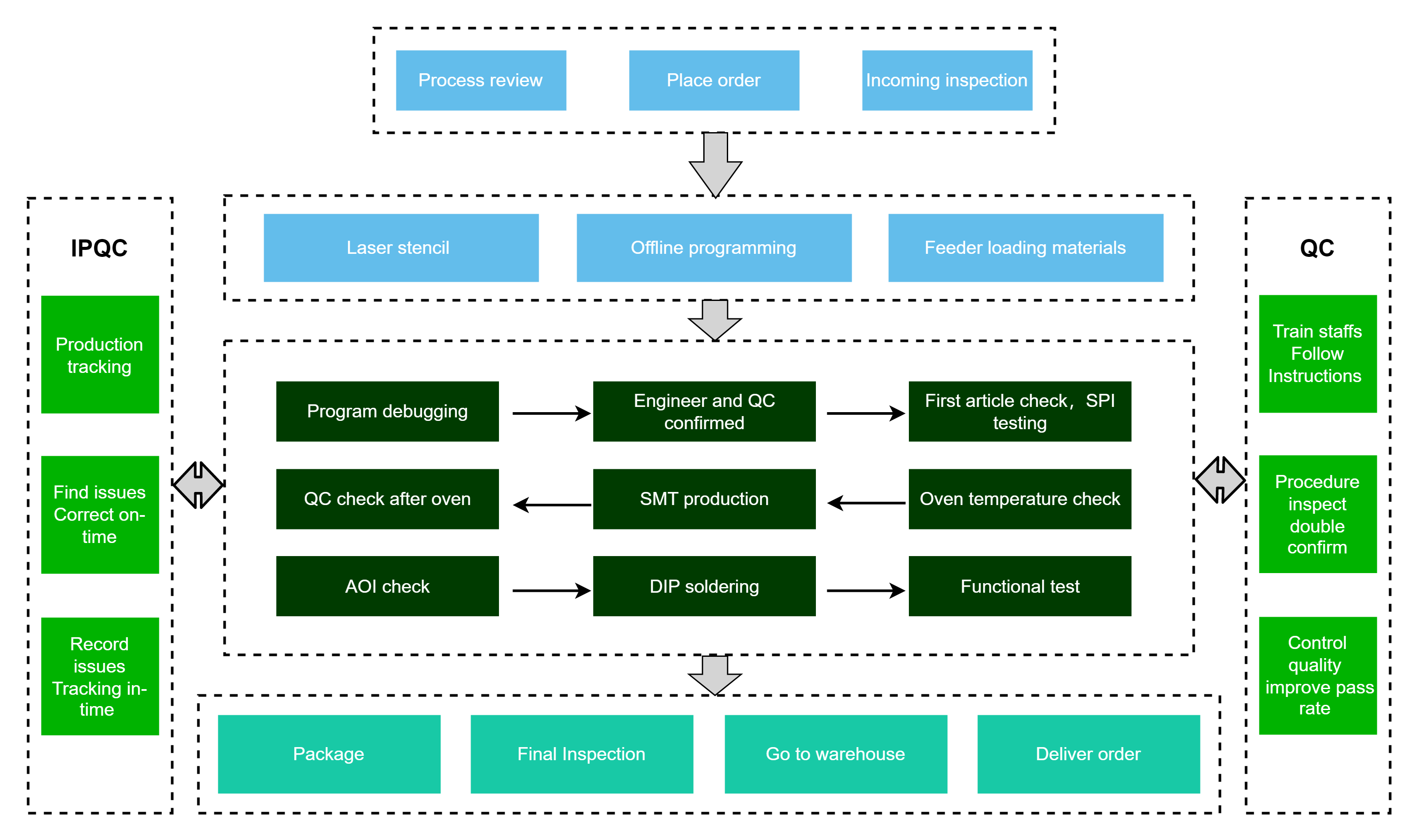 Our factory has 4 automatic SMT production lines with Yamaha brand and 10 temperature zones reflow oven. Workshop area takes 1000 square meters. Production department employs over 20 staffs. We are here to provide complicated and reliable PCB assembly service.